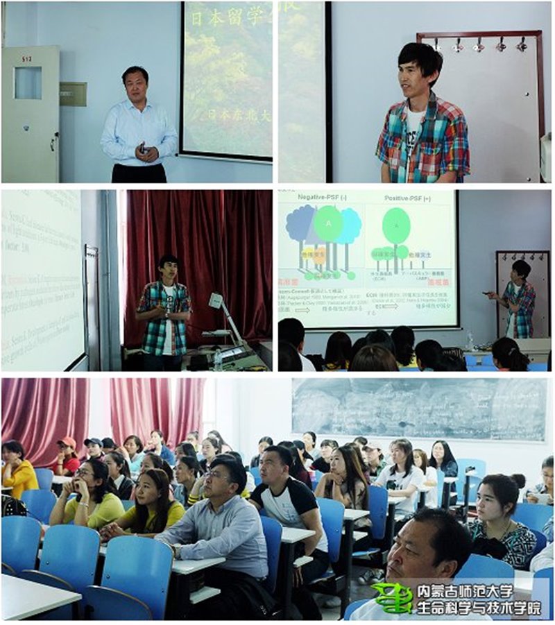 5月16日中午,我院2005届校友、日本东北大学博士巴音达拉应邀为我院师生作报告,介绍自己的成长经历和在日本的工作学习情况,并图文并茂的演示了自己在“病原菌和菌根菌对冷温带落叶阔叶林树木共存的影响”方面的主要研究成果。巴音达拉博士是新疆籍校友,2005年本科毕业于我院生物科学专业,2010从我院植物学专业硕士毕业(师从哈斯巴根教授)后赴日本东北大学留学,经过几年的刻苦学习和潜心研究,在生态学研究领域取得了优秀的成果,他的主要研究成果“Roles of pathogens on replacement of tree seedlings in heterogeneous light environments in a temperate forest: a reciprocal seed sowing experiment”发表在国际重要的学术期刊Journal of Ecology(生态学学报,SCI影响因子5.52)上,还有几项重要成果即将正式刊出。哈斯巴根院长主持报告会并介绍了巴音达拉校友,近60名师生聆听了报告。报告会后我院学生还与巴彦达拉博士就感兴趣的话题进行了愉快的交流。